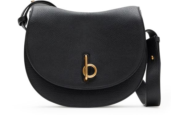 Burberry's Rocking Horse Handbag showcases a front logo, effortlessly blending elegance and playfulness. Worn on the shoulder or hand carried, its single handle and wide strap offer versatility. The flap closure reveals a single compartment, while the gold finish and visible stitching add a touch of sophistication to any outfit.