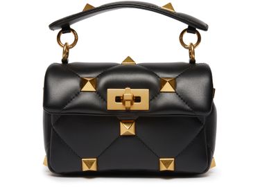 Roman Stud small shoulder bag is made of grained leather and features a chain shoulder strap. It has a flap closure with a twist lock closure adorned with Rockstud studs. The bag also has decorative Rockstud studs and visible topstitching. Finished with gold-tone accents, it can be worn over the shoulder or crossbody.