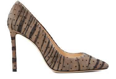 Jimmy Choo plays with feminine symbols by wrapping its iconic Romy 100 pumps in a sheer fabric with dotted swiss embroidery. The multiple pleats bring out the black and nude tones of this sophisticated shoe, while the rounded toe and 10 cm heel lengthen and sculpt the leg. Wear with a light-colored dress and black accessories, or with a black pantsuit.
