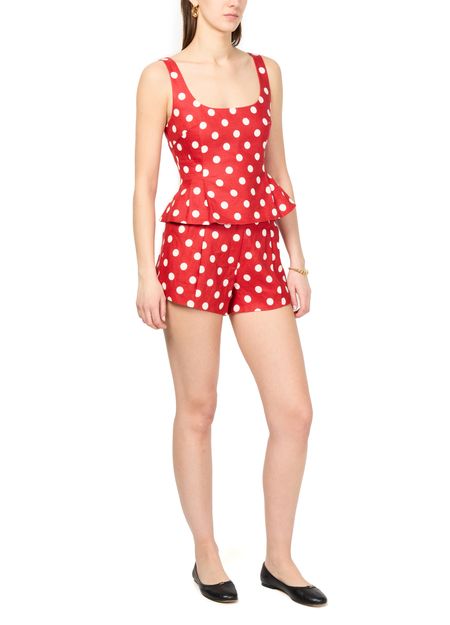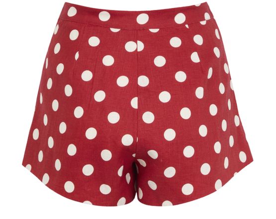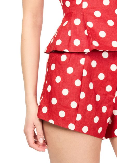 • Description : buttoned and concealed zipper closure, back darts, visible stitching, short length, all-over print, polka dot pattern, side pockets, high-waisted fit, pleats on the front.