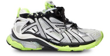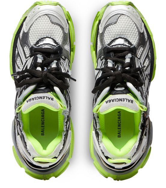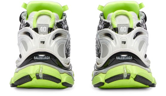 Balenciaga's Sneaker Runner is a leather-free shoe with a worn-out effect. It features a printed size at the edge of the toe, embossed size at the back, Runner logo printed on the exterior, and Balenciaga logo embroidered on the tongue. The back pull-on tab and Balenciaga logo at the back of the heel complete the design.