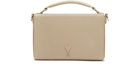 Ami's Sac Lunch Box Ami de Cœur features double handles, visible topstitching, a single compartment, leather handle, flap closure, magnetic closure, worn crossbody or hand carried, thin strap, silver finish, front logo, appliquéd logo, detachable strap, back pocket.