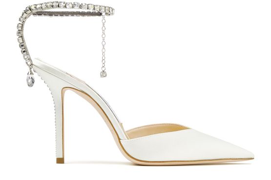 Jimmy Choo's Saeda 100 pumps feature a pointed toe and stiletto heel for a sleek and sophisticated look. The very thin sole adds to the elegance of the design, while the crystal-embellished strap and hook fastening provide a touch of glamour. The logo-printed insole and contrast details complete the chic and polished aesthetic.