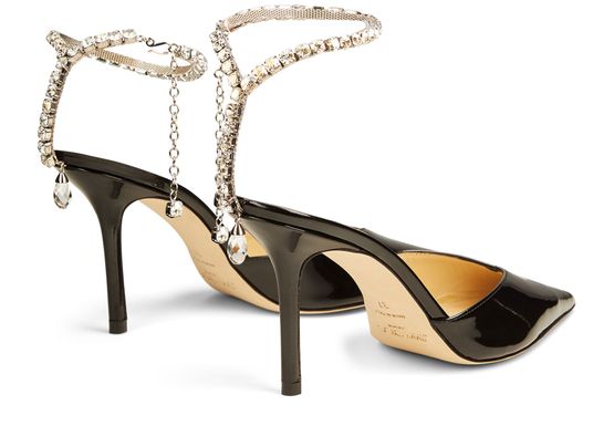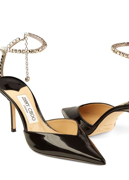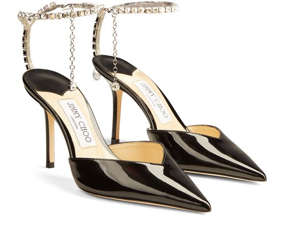 Jimmy Choo's Saeda 85 pumps are crafted from patent leather with a sleek shape. Featuring a pointed toe and an ankle strap with a crystal-embellished strap for a touch of glamour. The stiletto heel adds height, while the logo-printed insole provides comfort and style for any occasion.