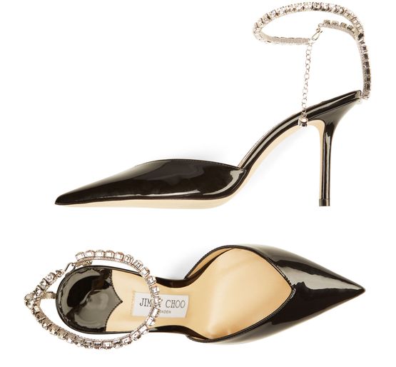 • Description : Pumps, patent leather, pointed toe, sleek shape, ankle strap, crystal-embellished strap, logo-printed insole, stiletto heel.