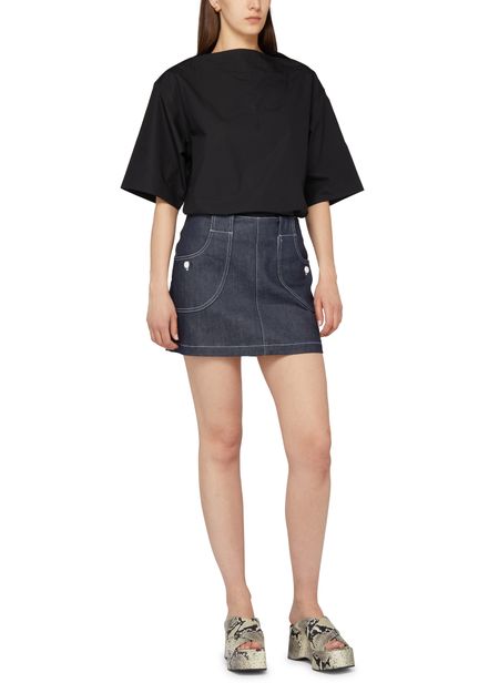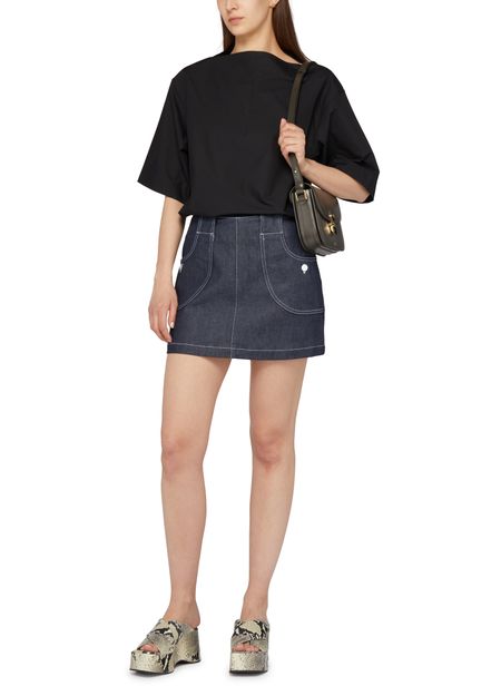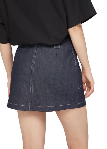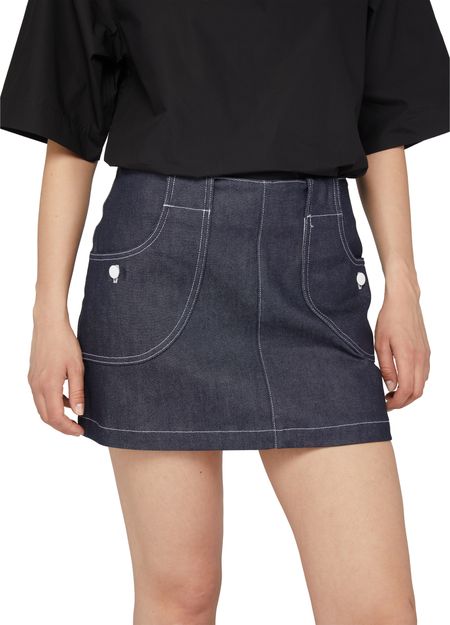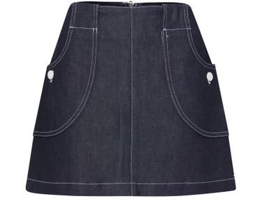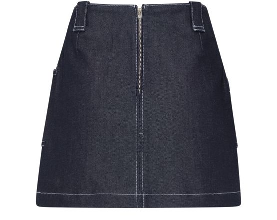 • Description : a-line skirt, mini, back darts, belt loops, back zipper closure, front logo, side pockets, visible stitching.