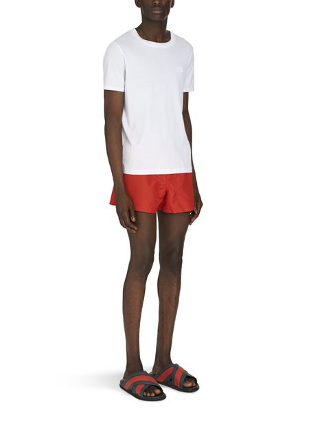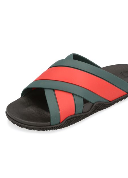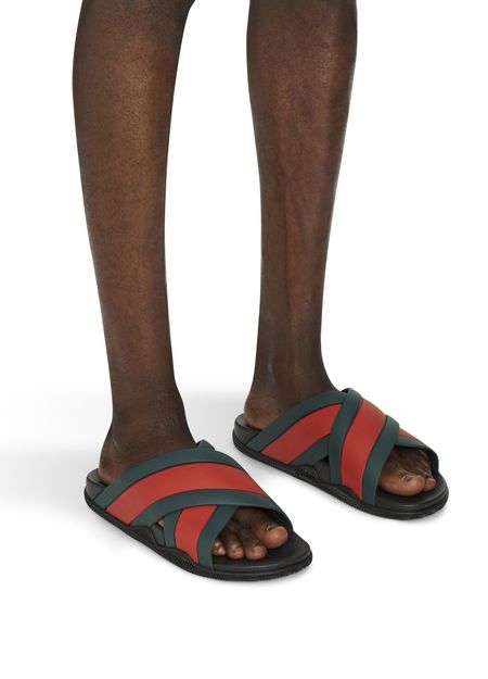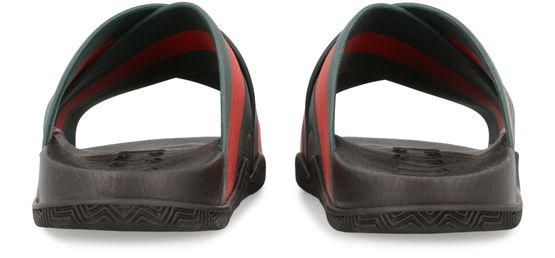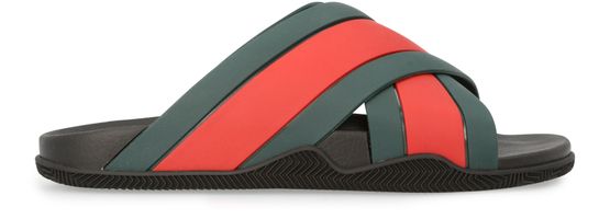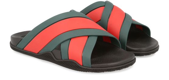These Gucci sandals are a must-have for the summer season. Two rubber Webbing bands cross to cover the foot with modernity and lightness.