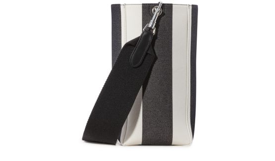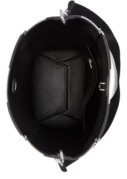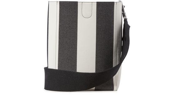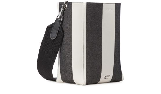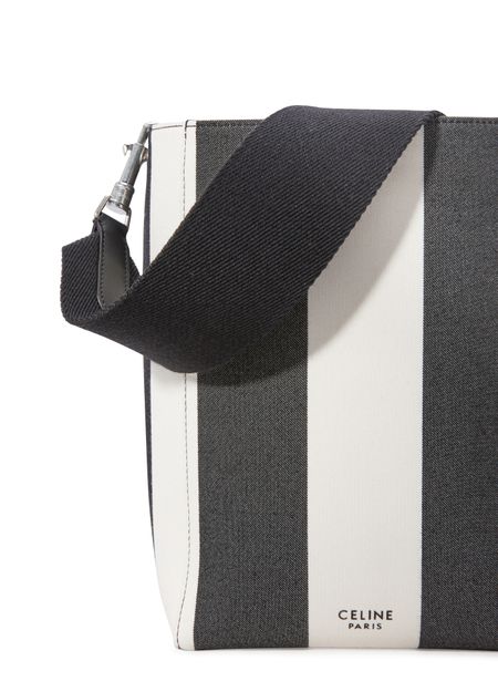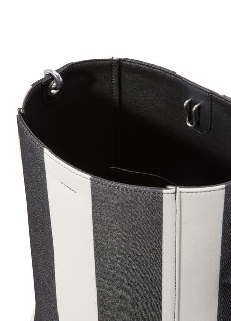 Sangle small bucket in striped textile with a removable wool strap and an inned hook-closure.