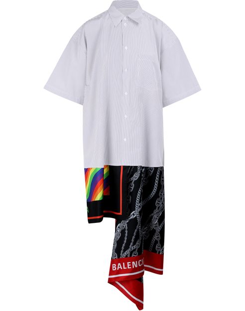With this scarf shirt dress, Balenciaga shakes things up. A perfect combination of patterns, this oversized poplin shirt dress mixes colours and stripes to emphasise its summer look.