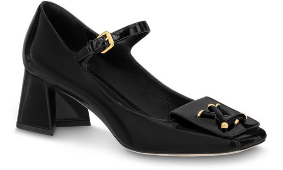 The Shake mary-jane pump combines bold lines with high-shine patent calf leather. This model is notable for its block heel with a graphic, V-shaped cutout and its tonal LV accessory, inspired by the Twist bag. A slender strap with a small, square buckle adds a feminine twist to this model, which is finished with a fine leather outsole.