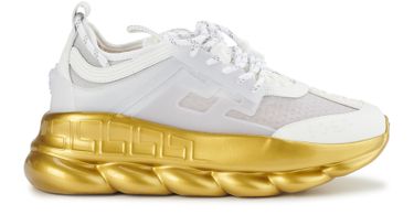 Versace brings striking symbols to this model of Shiny Chain Reaction sneakers. A men's model with bold details, revealing an elegant line full of panache. These sneakers stand out with their light rubber sole that takes the shape of a chain. A feature straight out of the brand's fetish themes, particularly in its jewelry collections.