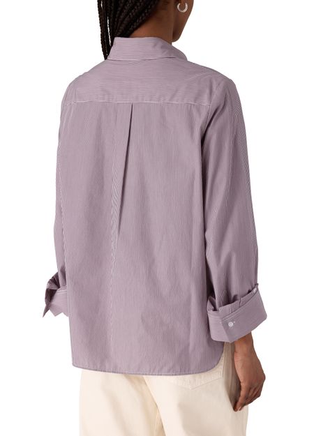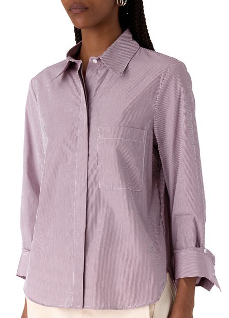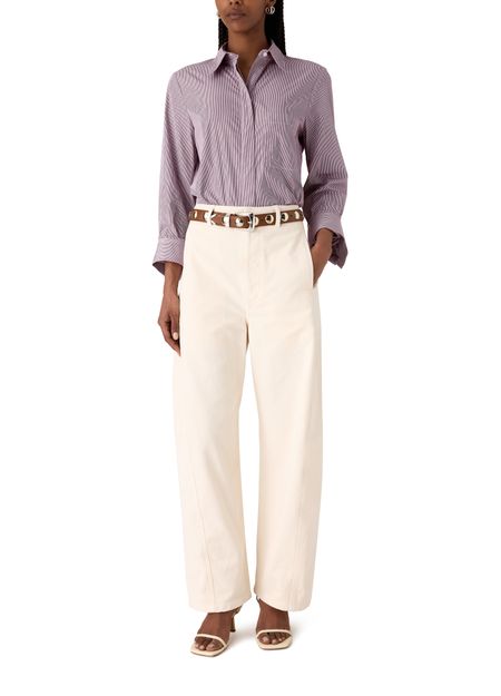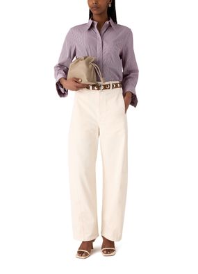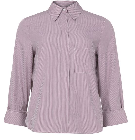 Reveal TWP's shirt with a boyfriend print, featuring three-quarter cuffed sleeves and a crisp striped print. The front buttoned closure and visible stitching add a refined touch, while the breast pocket offers subtle practicality. Perfect for elevating both casual and tailored looks with effortless sophistication.