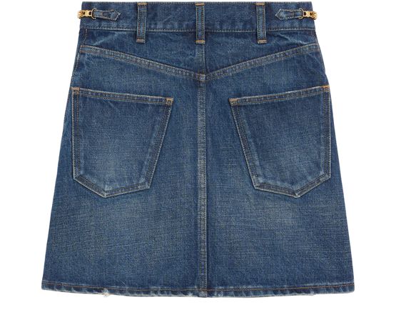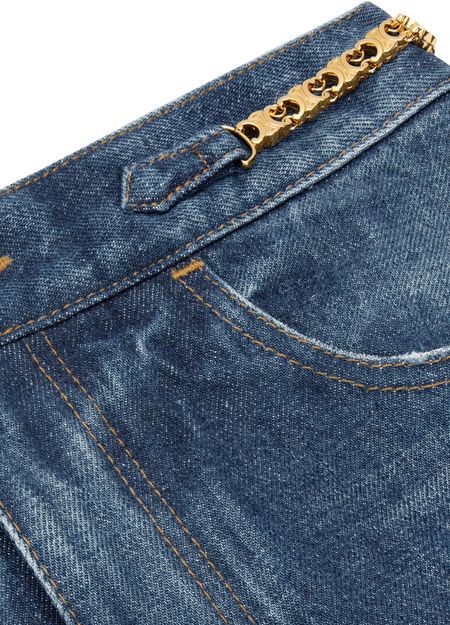 Description : dark union wash denim, triomphe gourmette chains at the waist, classic fit, mini length, high waist, 5 pockets, celine jeans-engraved zip and buttons, reference : 2s206365m.