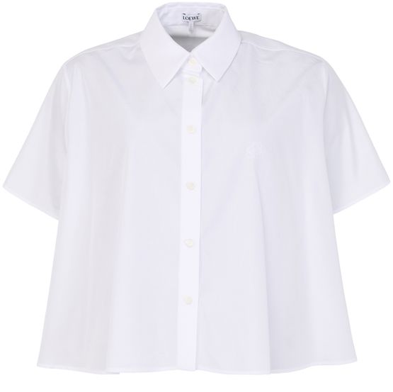 Introducing Loewe's short sleeve trapeze shirt in cotton, this top combines a boxy fit with a crop length for a modern silhouette. The button fastening and short sleeves add a relaxed touch, perfect for versatile styling across various occasions.