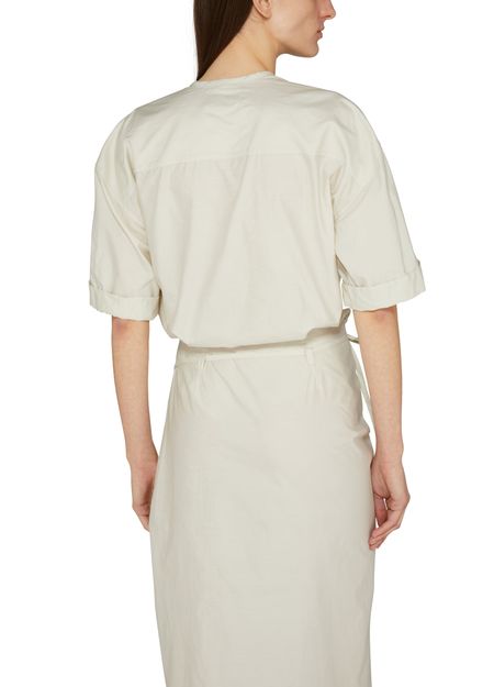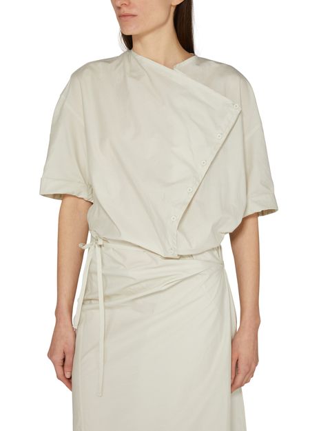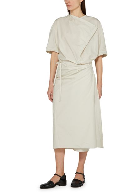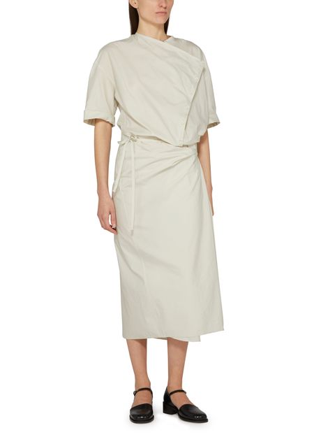 Lemaire's short sleeve wrap dress offers effortless elegance with its wraparound design and flattering wrap neckline. This midi dress drapes beautifully, accentuating the figure while providing comfort. A subtle logo at the back label adds a touch of sophistication, making it a perfect choice for both casual and chic occasions.