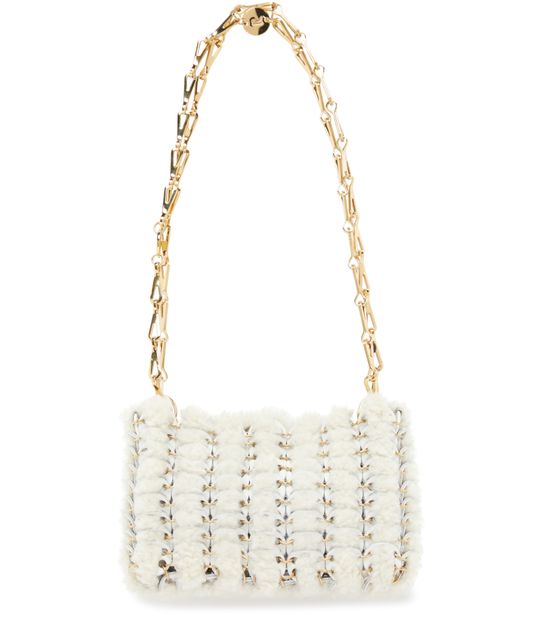 Paco Rabanne's Shearling shoulder bag is a chic mini bag showcasing an engraved logo in gold letters. Its single compartment offers practicality, while the double handles and chain strap allow it to be worn on the shoulder. The gold finish elevates any outfit, making it a must-have accessory.