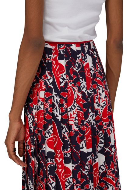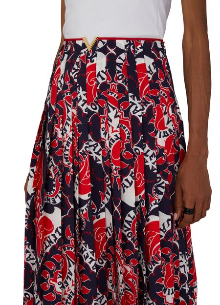 This Valentino skirt showcases a timeless design with its flat pleats and all-over pattern. The skirt features a front logo detail that adds a touch of elegance. The exquisite gold finishes bring a touch of sophistication to this stunning piece.