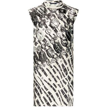 The runway’s essential sleeveless mini T-shirt dress silhouette in a graphic print from the Fornasetti collaboration. Cut from comfortable jersey with a shiny finish. A seasonal allover signature sets a playful retro tone, while motifs of cameos and coins reference the collection’s Ancient Greek and Roman theme. Complete with an iconic chain neck detail.