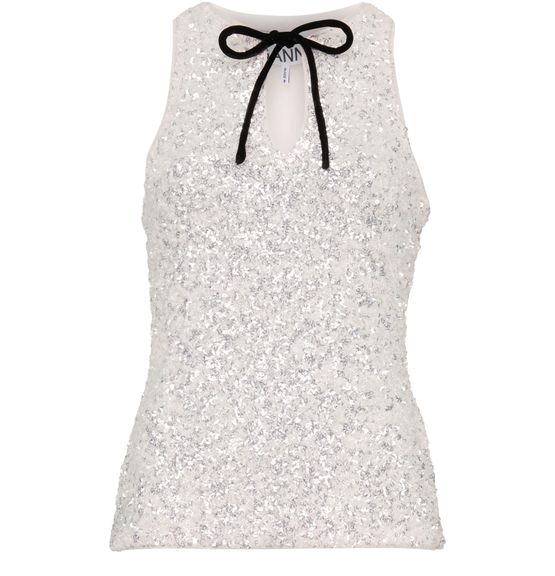 Ganni's sleeveless top features a v-neck with 3D sequin details, adding a touch of glamour to any outfit. The lavaliere/tie-neck adds a feminine touch, while the logo at the back label adds a subtle branding element. Perfect for a night out or special occasion, this top is sure to make a statement.