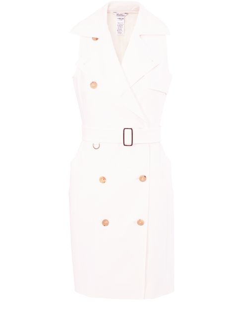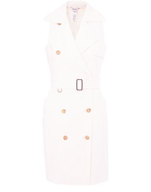 This sleeveless trench-coat-style dress by fashion house Max Mara is enhanced by two rows of pearly buttons and a notched lapel collar.