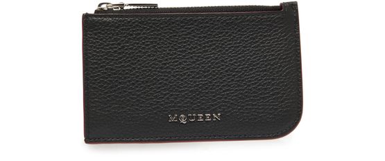 McQueen's Sling Zip card case showcases a sleek design with a zipper closure for secure storage. Its front logo in silver letters adds a touch of elegance, while the visible topstitching enhances durability. Perfect for those who appreciate style and functionality, this card case elevates everyday essentials effortlessly.