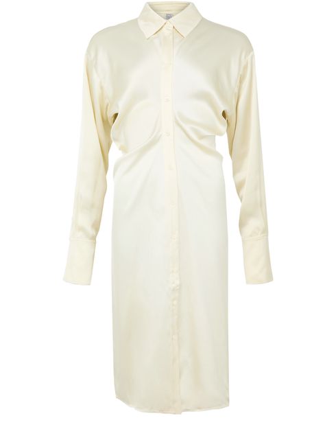 Reveal Toteme slouch midi shirt-dress, a knee-length long tunic with tailored collar and cuffed long sleeves. The button fastening and front slit add a refined touch, while the fluid silhouette ensures effortless sophistication. Perfect for versatile styling, this piece transitions seamlessly from day to evening.