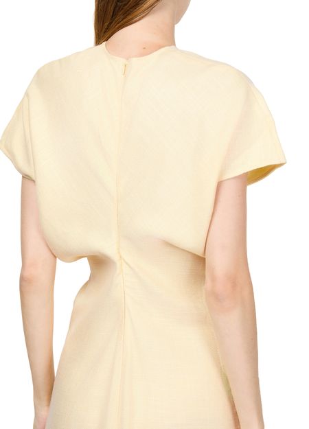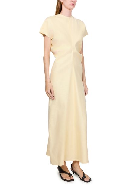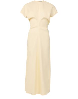 Discover Toteme's slouch waist crinkled dress, a stunning midi piece with a round neck and short sleeves. The back zipper closure ensures a seamless fit, while its textured design adds a modern twist. Perfect for any occasion, this dress seamlessly blends comfort and style.
