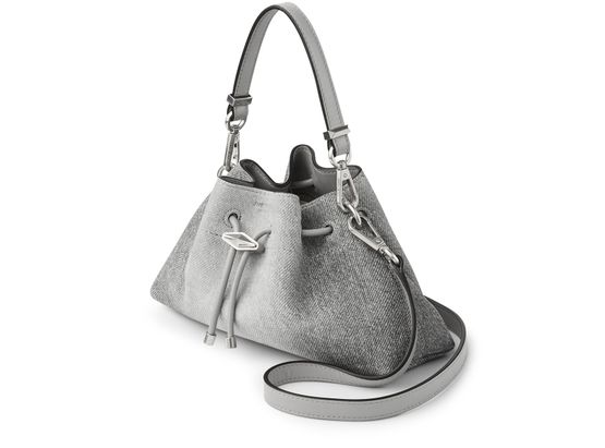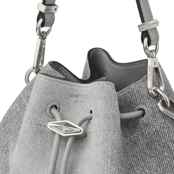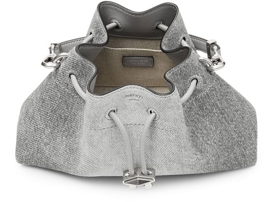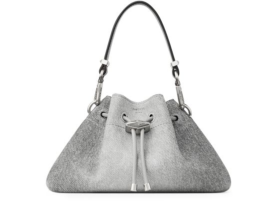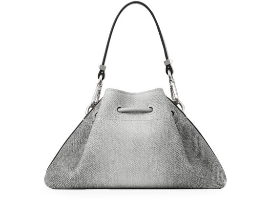 Reveal Jimmy Choo's small cinch bag, a statement piece with a sleek silhouette. The adjustable, detachable thin strap and single handle offer versatile styling, while the drawstring closure and visible stitching highlight refined craftsmanship. A front engraved logo and silver finish complete this modern, functional accessory.