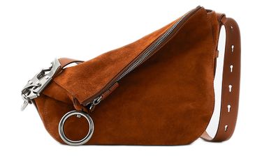 Small Knight bag in suede is a versatile accessory with a carabiner, perfect for wearing on the shoulder or with its single handle. It also features a detachable wide strap, silver finish, and zipper closure for added security. This stylish bag is perfect for any occasion and outfit.