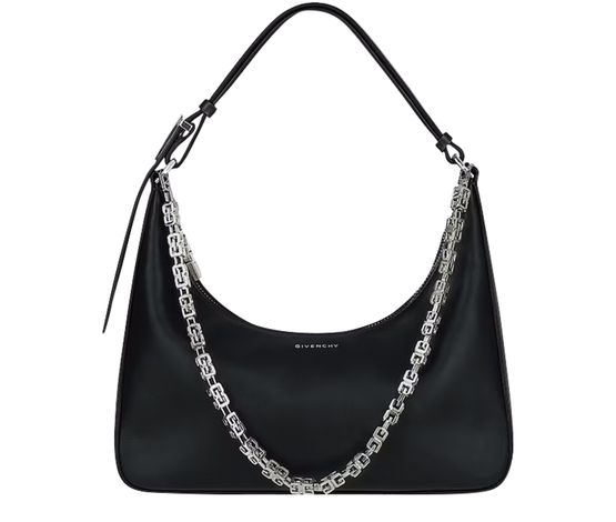 Givenchy's Small Moon Cut Out Bag is a versatile accessory that can be hand carried or worn on the shoulder. It features a decorative chain for added style and a secure zipper closure. This elegant bag is perfect for adding a touch of sophistication to any outfit, day or night.