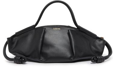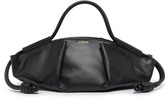Loewe's Small Paseo bag is a chic accessory with a front logo in gold letters. It has a zipper closure and can be hand carried, worn on the shoulder, or worn crossbody with its wide strap. The bag has a gold finish and features a printed logo. The adjustable strap is detachable for versatility.