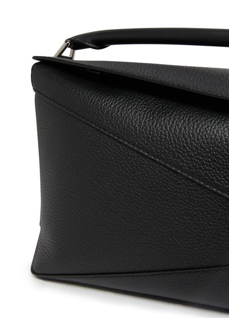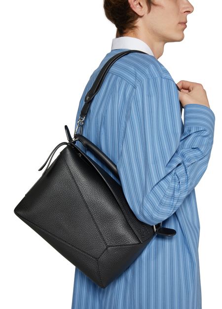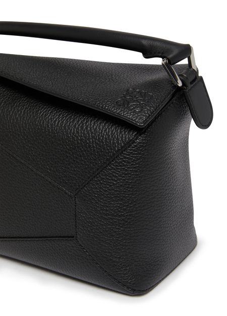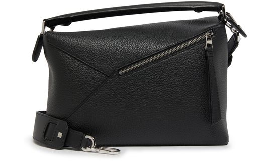 Loewe's Small Puzzle Bag is a chic accessory with a modern design. Made from luxurious leather, it boasts an embossed logo and a zipper closure for security. This versatile bag can be worn on the shoulder for a trendy look.