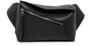 Loewe's Small Puzzle Bumbag is a versatile accessory designed to be worn on the hips or on the waist. It features an adjustable wide strap, a zippered front pocket, and a silver finish. The bag has a zipper closure and a single handle for easy carrying.