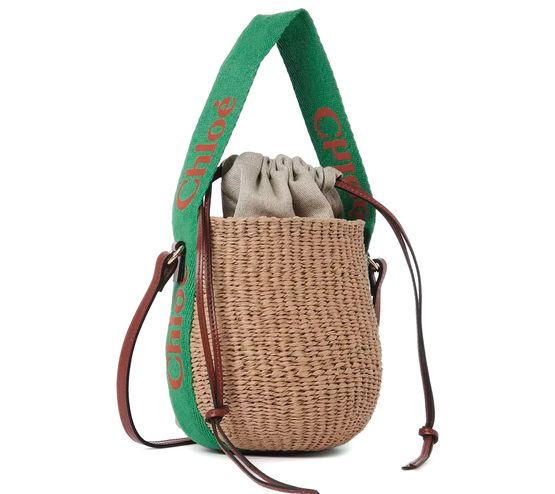 Chloe's Small Woody basket is a versatile accessory with a thin strap and a handle, offering the option to be worn in the hand or on the shoulder. Its minimalist design features a printed logo, making it a chic and practical choice for carrying essentials in style.