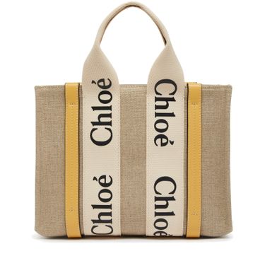The Small Woody tote bag from Chloé features handles and a detachable strap for versatile carrying options. It is designed with Chloé lettering and an appliquéd logo, and has a single compartment with an interior patch pocket. The bag can be hand carried, worn on the shoulder, or as a crossbody with an adjustable shoulder strap. Height of handle: 11 cm and shoulder strap: 52...