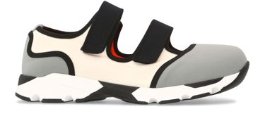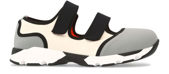 • Description : Leather sneakers, graphic cut-outs, velcro fastening, wide straps, thick, notched sole, contrast lining, fabric interior.