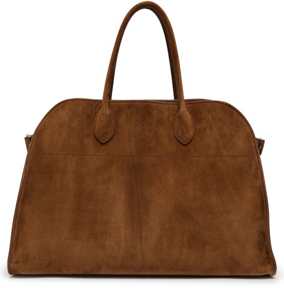 The Row Soft Margaux 15 bag is a stylish and practical accessory for any fashion-conscious individual. It features two handles for easy carrying, and is made from aged suede for a unique and distressed look. The visible stitching adds a touch of detail, while the large interior compartment and zippered pocket provide ample storage space for all your essentials.
