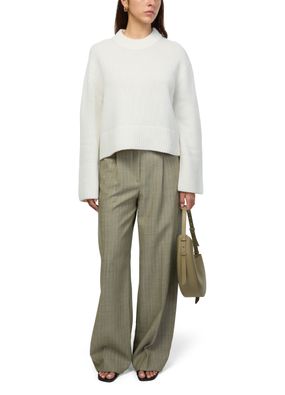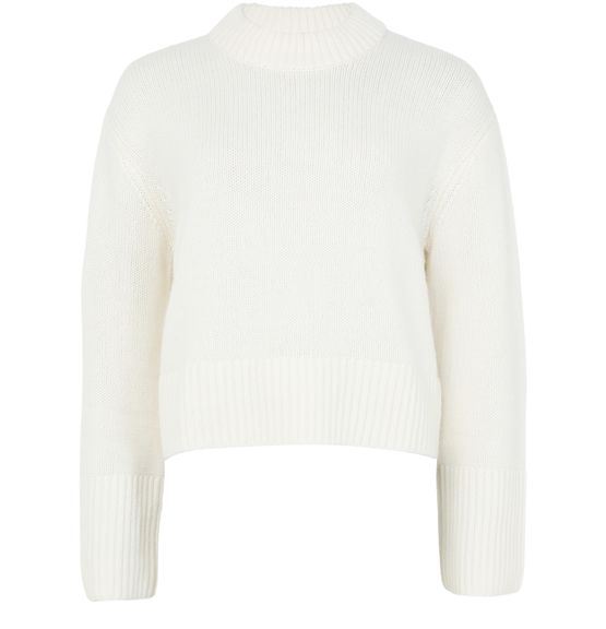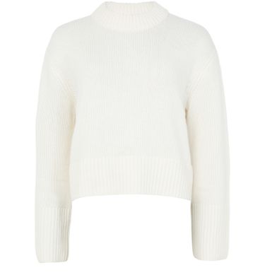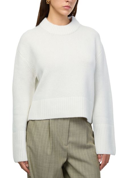 Reveal Lisa Yang's cashmere round-neck sweater, a cropped knitwear piece with a ribbed texture and dropped long sleeves. The round neckline and relaxed fit offer effortless sophistication, making it a versatile choice for layering or standalone styling across seasons.