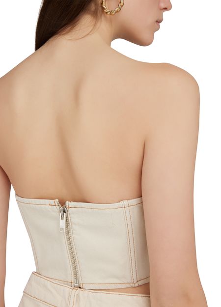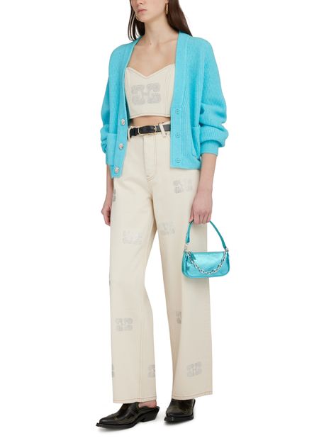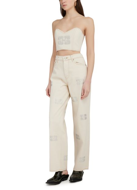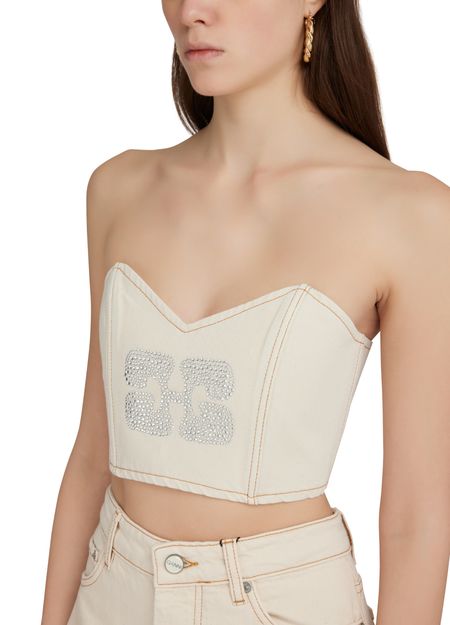 Ganni's Sparkle Denim Top is a sleeveless top with a classic neckline and visible stitching details. It features a label with the brand's logo and is designed in a slim fitting silhouette. Perfect for adding a touch of sparkle to your everyday look.