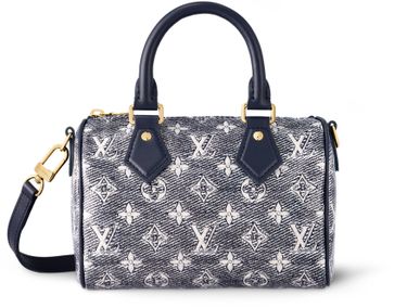 The eye-catching Speedy Bandoulière 20 handbag hails from the season’s Monoglam animation. It is crafted from Monoglam jacquard canvas woven from cotton, then laminated for a metallic shine. What’s more, the material’s holographic blue tint reflects changes in light, creating novel chromatic variations. Navy leather trim adds a sculptural effect to this statement Speedy.