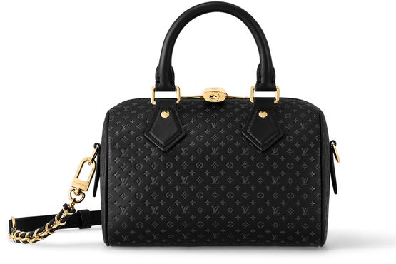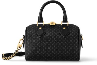 Fashioned from calfskin with a very small Monogram motif embossed then printed on the leather, this Speedy 20 handbag is part of the Nanogram capsule. Its inimitable silhouette, and engraved padlock, make this bag instantly recognizable. A removable and adjustable braided-chain-and-leather strap enables shoulder or cross-body carry.