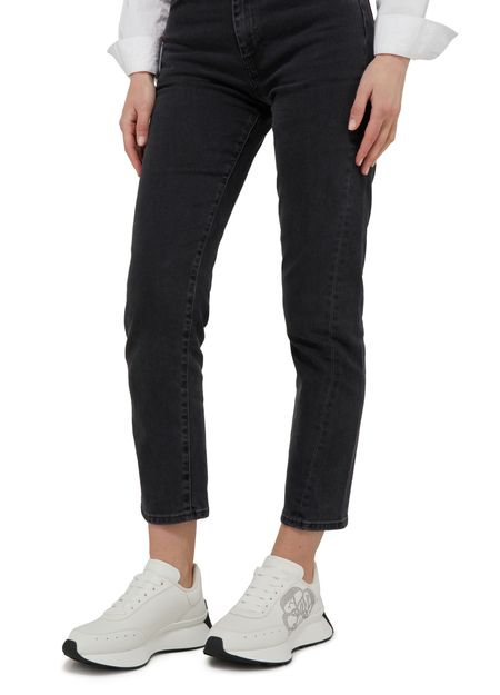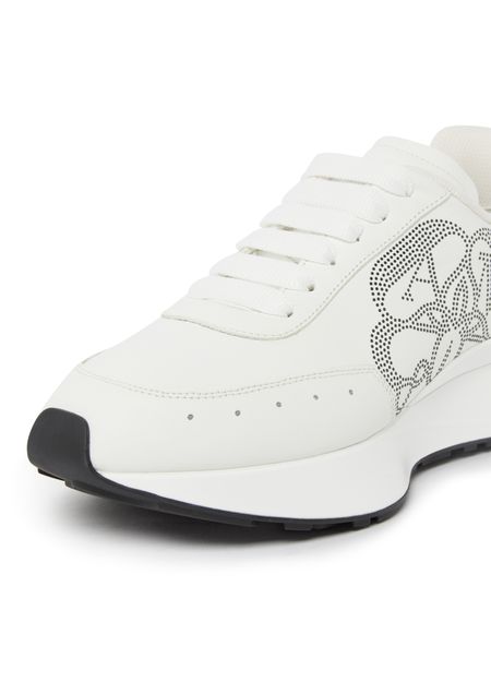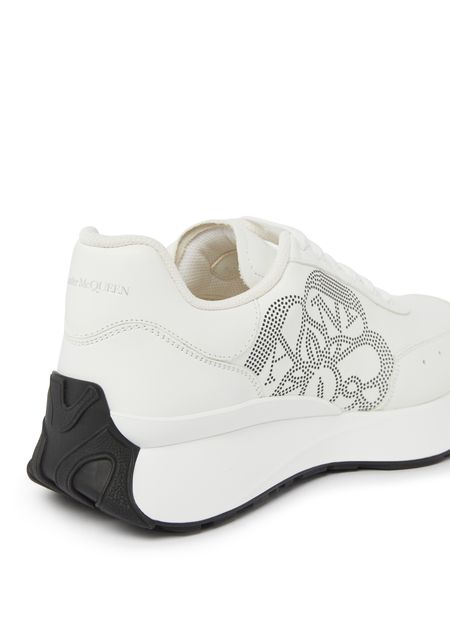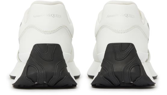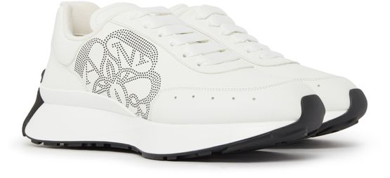 Alexander McQueen's Sprint Runner sneakers feature a round toe and closed design for a comfortable fit. The shoes showcase the brand's logo on the tongue, back, and side, all in silver letters. These stylish sneakers blend luxury and sporty elements, making them a versatile choice for casual wear.