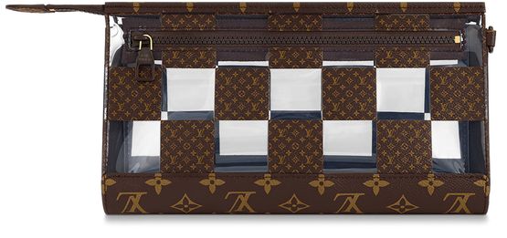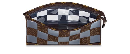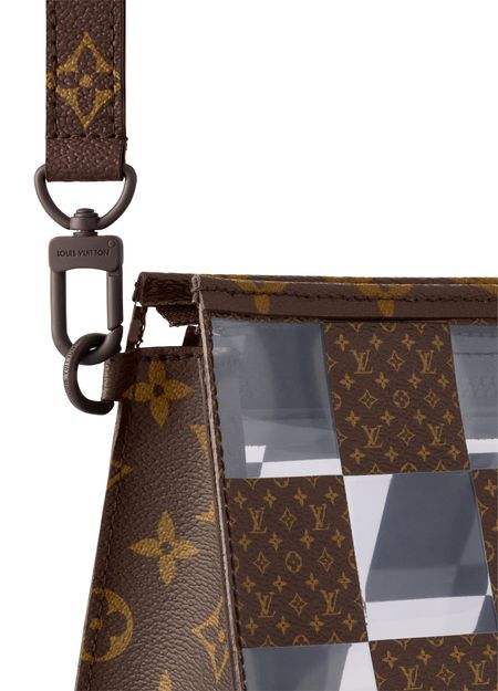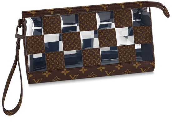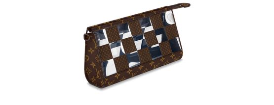 With its innovative design inspired by the triangular Sac Tricot bag from 1934, the Standing Pouch is an on-trend, original way to carry everyday personal necessities. This Monogram Chess version offers a fun contemporary take on two of Louis Vuitton’s most iconic patterns: the Damier squares and the classic Monogram motif, combined with crystal-clear PVC.