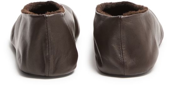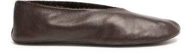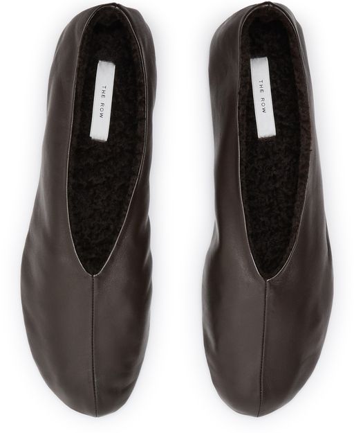 Reveal The Row's Stella ballet flats, crafted from smooth leather and shearling with a refined round closed toe and a flat heel for effortless sophistication. The pull-on design and soft lining ensure comfort, while the printed logo adds a subtle signature touch to these modern ballet pumps.