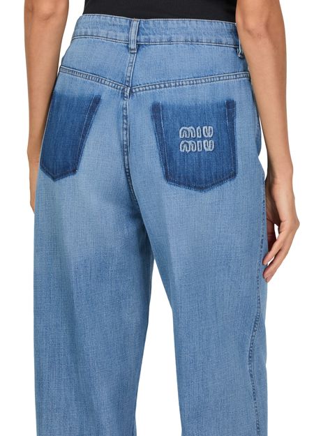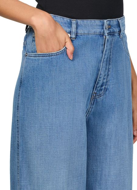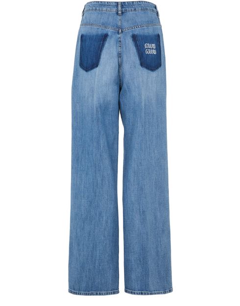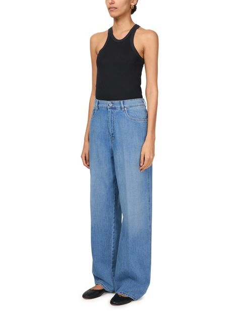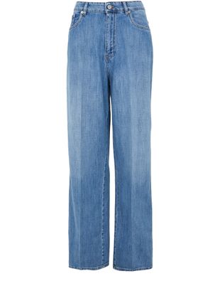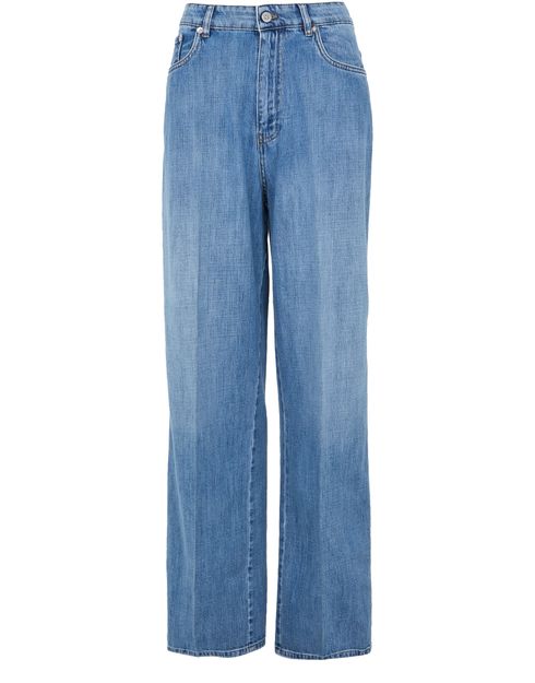 Introducing Straight-cut jeans by our esteemed brand. These jeans boast a high-waisted fit, offering both style and comfort with their ankle-length wide cut. Crafted from faded denim, they feature visible stitching, belt loops, and a buttoned zipper closure. Functional details include two front pockets, a back patch pocket, and a logo at the back, perfect for versatile styling.