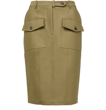 Tom Ford Distribution's Stretch cotton tricotine skirt combines elegance and functionality. With a knee-length pencil silhouette, it features a buttoned and concealed zipper closure, belt loops, and visible stitching. Flap and welt pockets enhance its practicality, while two front pockets and a back pocket add stylish convenience for everyday wear.