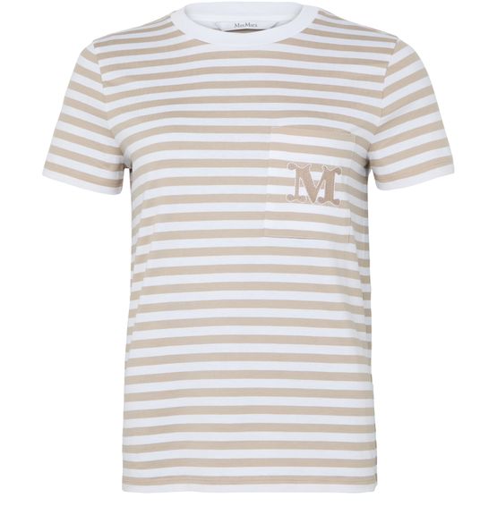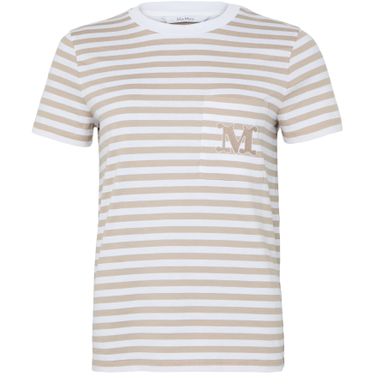 Reveal Max Mara's striped t-shirt with logo, featuring a classic crew neck and short sleeves for a timeless silhouette. The striped print and chest logo add a modern twist, while the breast pocket offers subtle detail. Perfect for elevating everyday looks with effortless sophistication.