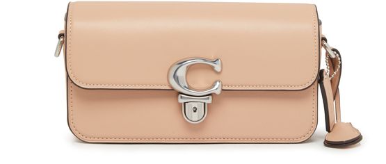 Coach's Studio Baguette shoulder bag features a flap closure and a thin strap for effortless wear on the shoulder or crossbody. The silver finish accents the bag beautifully, while the metallic logo on the front adds a touch of elegance. The logo in silver letters completes the chic and sophisticated look.