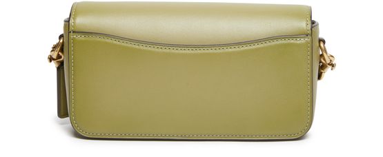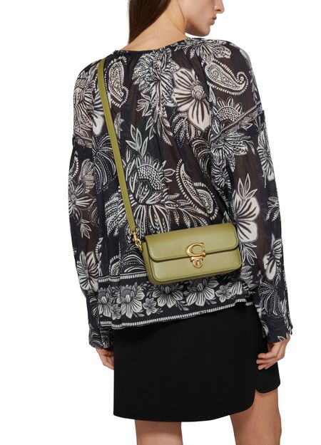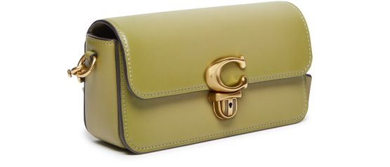 Coach's Studio Baguette shoulder bag features a metallic logo on the front with the brand's logo in gold letters. It has a flap closure, single compartment, and can be worn on the shoulder or crossbody with its thin strap. The bag also includes a single handle, interior patch pockets, and a luxurious gold finish.