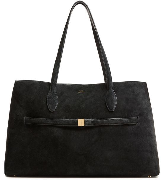 Reveal Toteme's suede lounge tote bag, a masterpiece of modern design. Crafted from premium suede, it features a spacious interior with a large compartment and open pocket. The double handles and visible topstitching add to its elegance, while the embossed front logo and metallic finish complete the sophisticated look.